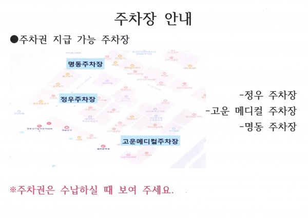 주차장 안내 페이지 정보 작성자 고운통증의학과 작성일25-11-12 10:16 조회73회 댓글0건 다음글 목록 본문 ※ 주차안내 - 고운메디컬빌딩 지하 주차장 - 정우주차장 - 명동 주차장 주차권 지급 가능합니다. 댓글목록 등록된 댓글이 없습니다. 다음글 목록