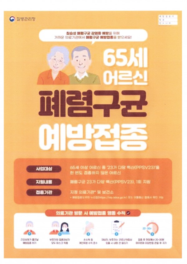65세 이상 어르신 폐렴접종 안내 페이지 정보 작성자 고운통증의학과 작성일25-05-16 16:54 조회635회 댓글0건 이전글 다음글 목록 본문 65세 이상 어르신 무료 폐렴구균 접종이 가능합니다. (1회 지원) 댓글목록 등록된 댓글이 없습니다. 이전글 다음글 목록