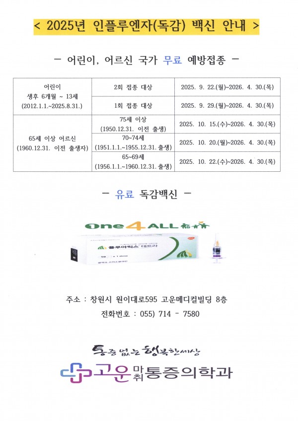 2025년 독감 접종 안내 페이지 정보 작성자 고운통증의학과 작성일25-09-20 11:16 조회431회 댓글0건 이전글 다음글 목록 본문 2025년 독감 접종을 시작합니다. -통증없는 세상을 꿈꿉니다- 댓글목록 등록된 댓글이 없습니다. 이전글 다음글 목록